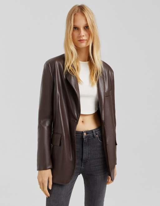 Bershka – Oversize-Blazer aus Kunstleder in Schokoladenbraun