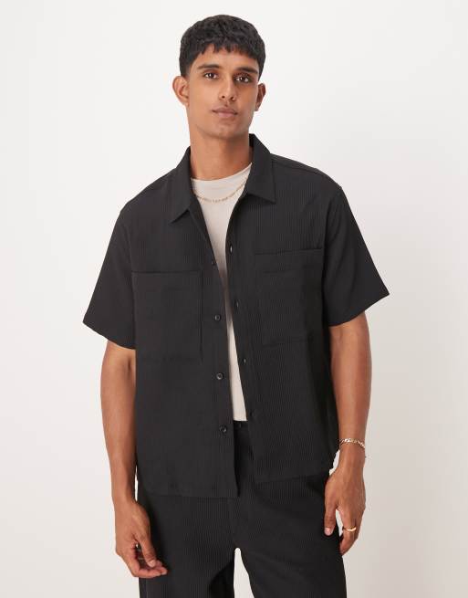 Bershka – Plissiertes Hemd in Schwarz mit Taschen, Kombiteil