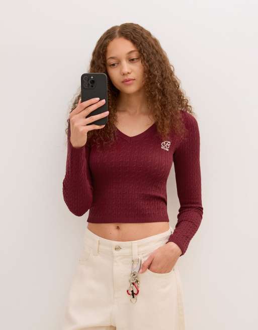 Bershka – Pullover in Burgunderrot mit gesticktem Zopfmuster