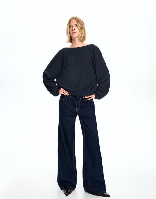 Bershka – Pullover in Marineblau mit Rückenausschnitt