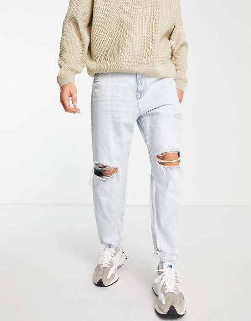 Bershka – Schmal zulaufende Jeans in Hellblau mit Rissen
