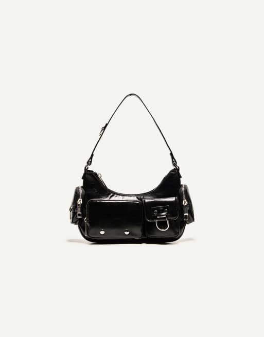 Bershka – Schultertasche in Schwarz mit mehreren Taschen