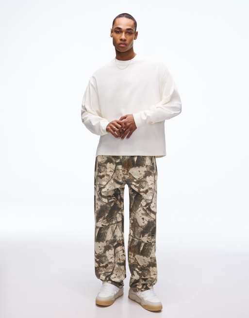 Bershka – Sehr weite Hose in Braun mit Print