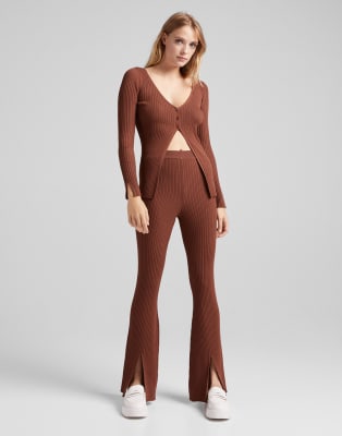 Bershka – Set, bestehend aus Strickjacke und Schlaghose in Schokolade
