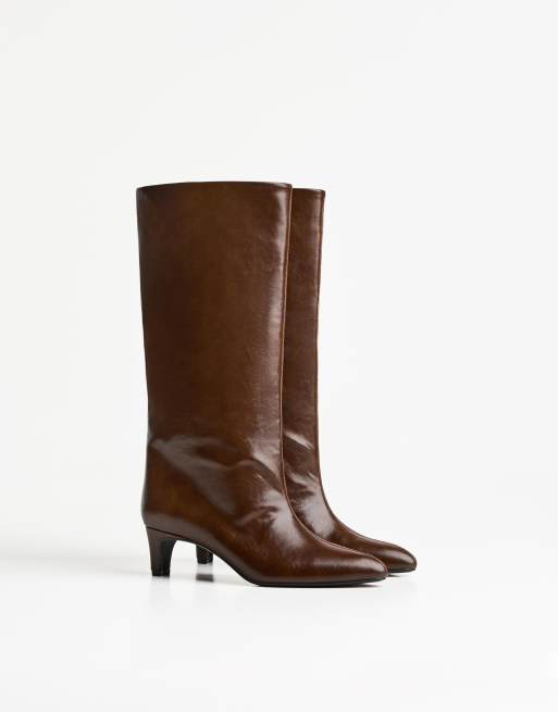 Bershka – Stiefel in Braun mit weitem Schaft und hohem Absatz