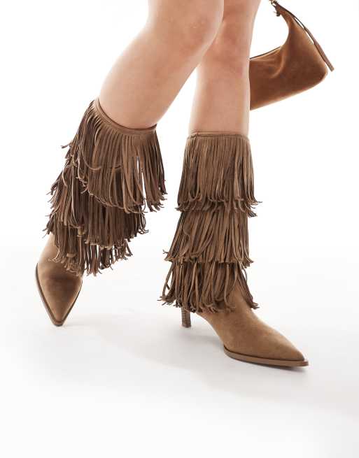 Bershka – Stiefel in Hellbraun mit Kitten-Absatz und Fransenbesatz