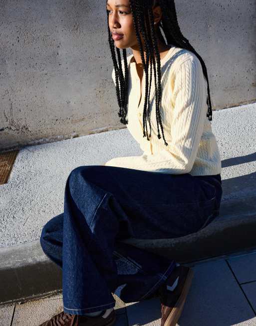 Bershka – Strickjacke in Gelb mit Zopfmuster und Knopfleiste
