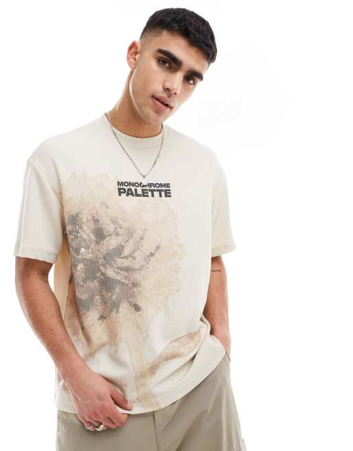 Bershka – Strukturiertes T-Shirt in Ecru mit Print