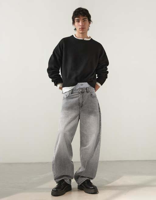 Bershka – Superweite Jeans in Hellgrau mit Stickerei