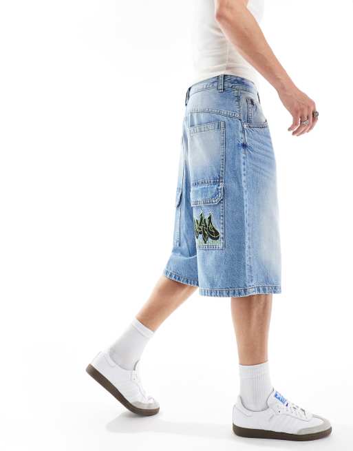 Bershka – Superweite Jeans-Jorts in Mittelblau