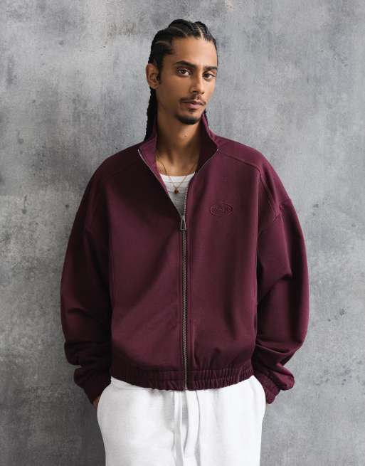 Bershka – Sweatshirt in Burgunderrot mit Reißverschluss und Print