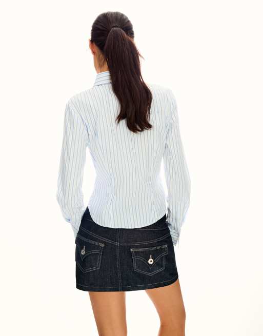 Bershka – Tailliertes Hemd in Jeansblau mit Schlitz