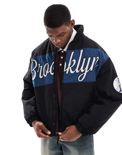 Bershka – Trainingsjacke aus Nylon in Schwarz mit „Brooklyn“-Print