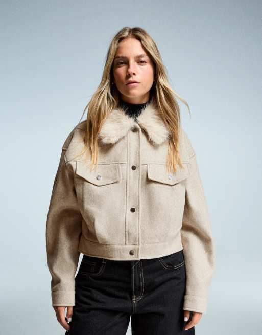 Bershka – Weiche Truckerjacke in Beige mit Kunstpelzkragen