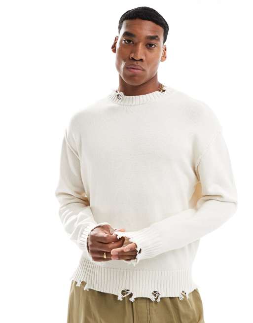 Bershka – Weißer Strickpullover im abgenutzten Look