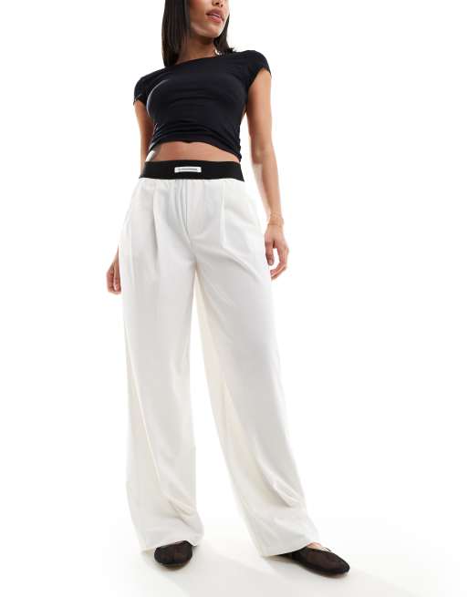 Bershka – Weit geschnittene Hose in Hellgrau mit breitem Bund