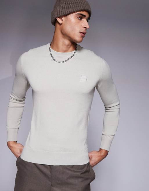 BOSS Orange – Kanovano – Baumwoll-Strickpullover in Beige in regulärer Passform mit farblich abgestimmtem Logo