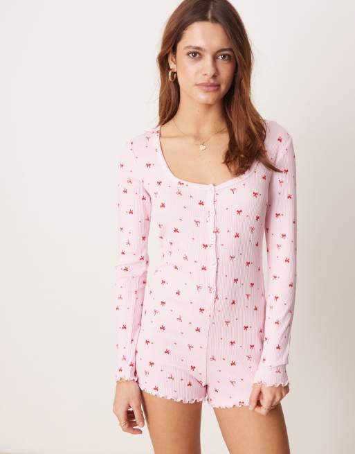Boux Avenue – Gerippter Playsuit in Rosa mit Schleifenprint