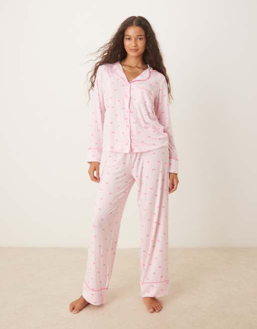 Boux Avenue – Pyjamaset in Rosa mit Streifen- und Schleifenmuster aus langärmligem Oberteil Reverskragen und Hose