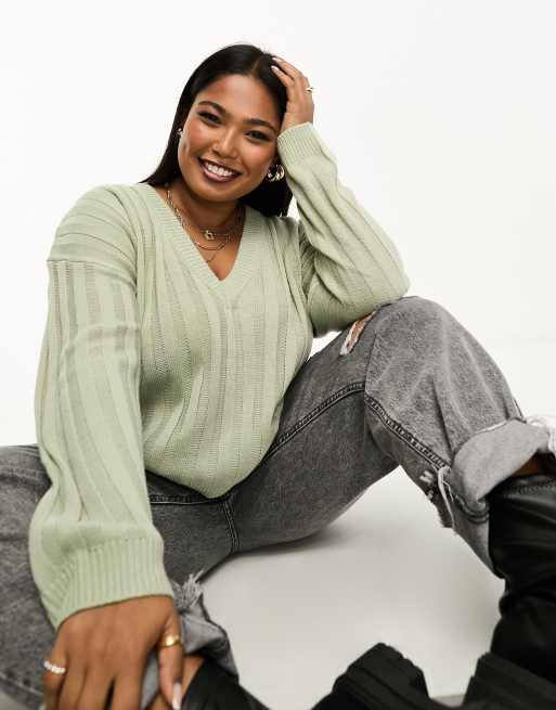 Brave Soul Plus – Kansas – Gerippter Pullover in Salbeigrün mit V-Ausschnitt