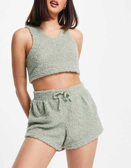 Brave Soul – Bethan – Lounge-Set aus Teddyfell in Salbeigrün