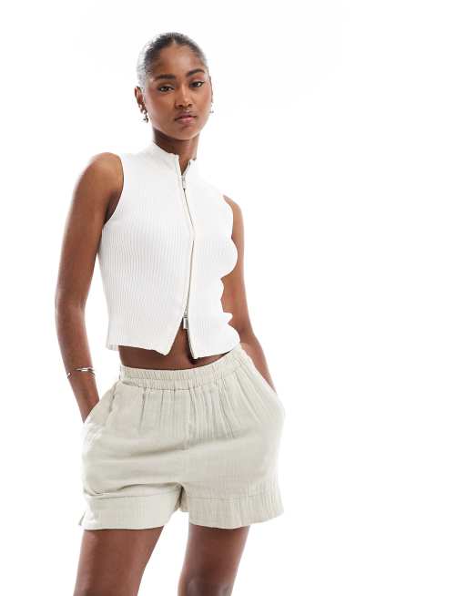 Brave Soul – Gerippte Strickweste in Cremeweiß mit Reißverschluss