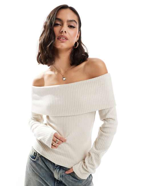 Brave Soul – Gerippter, schulterfreier Pullover in Creme
