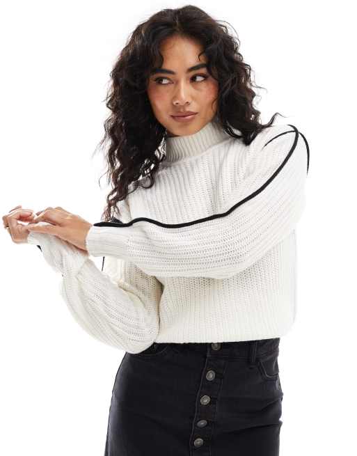 Brave Soul – Hochgeschlossener Strickpullover in Elfenbeinweiß mit überschnittener Schulter und schwarzer Kontrastnaht