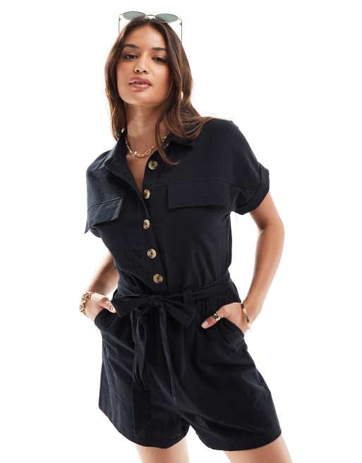 Brave Soul – Kurzärmliger Playsuit in Schwarz mit Knopfleiste vorne und Gürtel