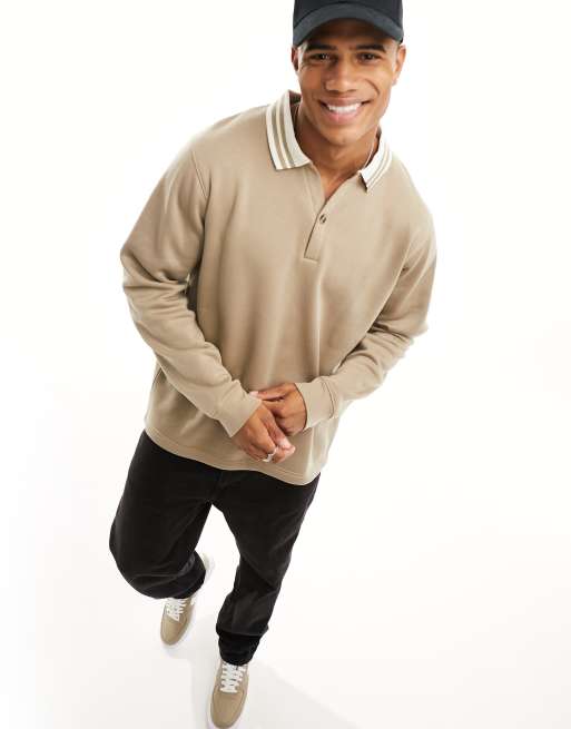 Brave Soul – Locker geschnittenes Sweatshirt in Steinbeige mit Polokragen mit Zierstreifen