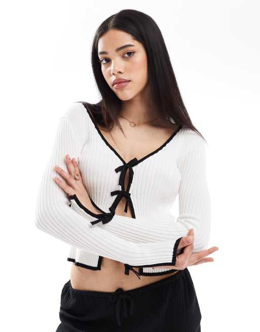 Brave Soul – Vorne gebundene Strickjacke in Creme mit schwarzen Kontrastdetails