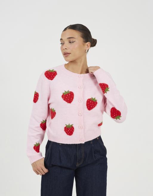 Brave Soul – Weiche Strickjacke in Rosa mit Erdbeer-Jacquardmuster