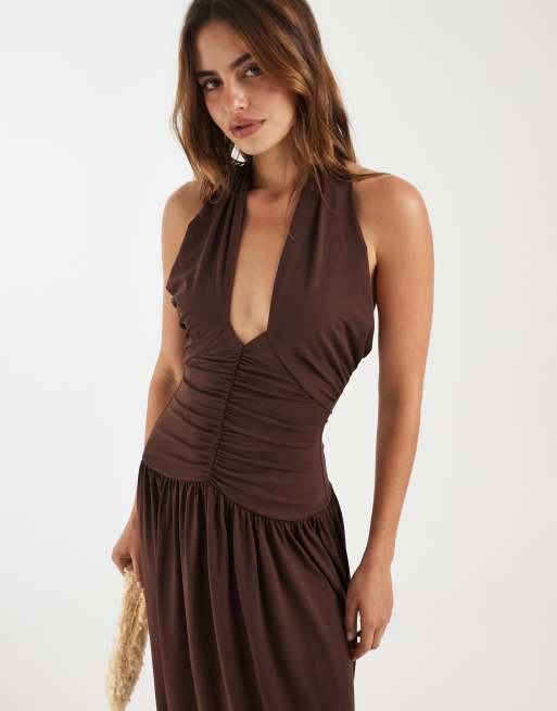 Bronze Snake – Marley – Midaxi-Kleid in Schokobraun mit geraffter Taille und Bindedetail