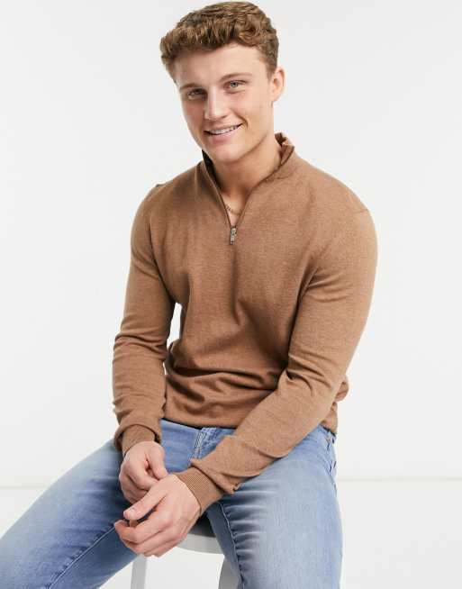 Burton Menswear – Pullover mit kurzem Reißverschluss in Hellbraun