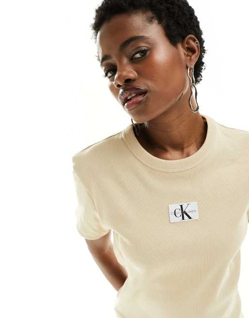 Calvin Klein Jeans – Geripptes T-Shirt in Sand mit Labellogo aus Webstoff