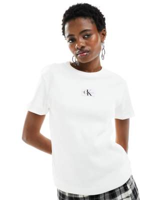 Calvin Klein Jeans – Geripptes T-Shirt in Weiß mit Labellogo aus Webstoff