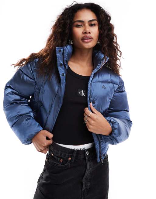 Calvin Klein Jeans – Kurze, glänzende Pufferjacke in Hellblau