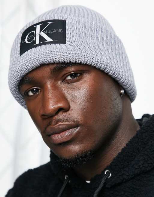 Calvin Klein Jeans – Strickmütze in Grau mit Monogramm-Aufnäher