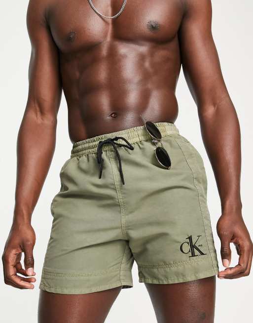 Calvin Klein – Badeshorts in Khaki mit kleinem Markenlogo