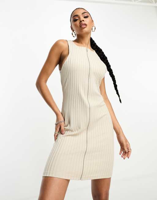 Calvin Klein – Geripptes Minikleid in Beige mit durchgehendem Reißverschluss