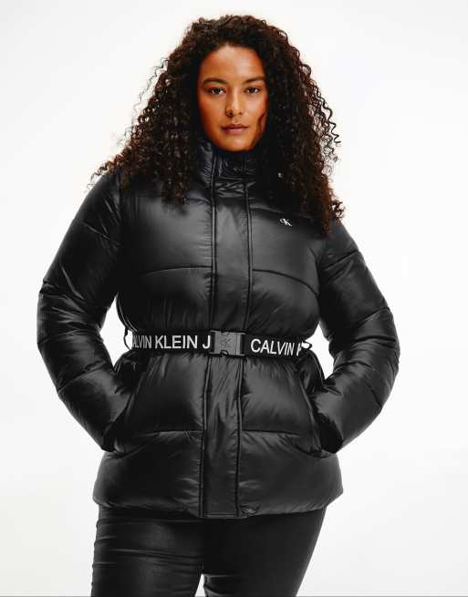 Calvin Klein Jeans Plus – Pufferjacke in Schwarz mit Logogürtel