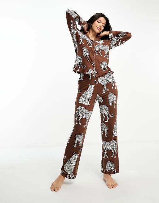 Chelsea Peers Exclusive – Jersey-Pyjama aus geknöpftem Oberteil und Hose in Braun mit Leopardenmuster