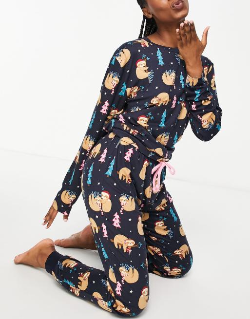 Chelsea Peers – Langer Pyjama in Marineblau mit weihnachtlichem Faultier