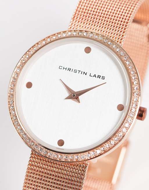 Christin Lars – Damen – Minimalistische Armbanduhr in Roségold mit Armband aus Netzstoff