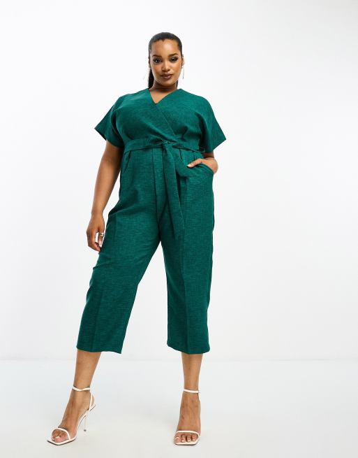 Closet London Plus – Kimono-Jumpsuit in Smaragdgrün mit Bindegürtel