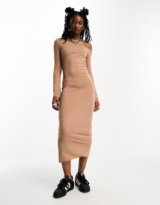 ASOS DESIGN – Langärmliges Midikleid in Braun mit One-Shoulder-Design