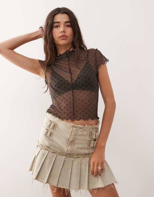 COLLUSION – Enges T-Shirt in Braun mit Punktemuster und hohem Kragen