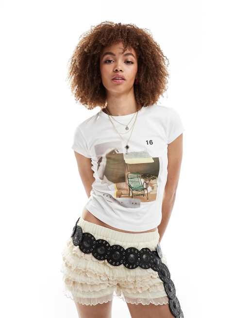 Collusion – Figurbetontes T-Shirt in Weiß mit grafischem Print und Flügelärmeln