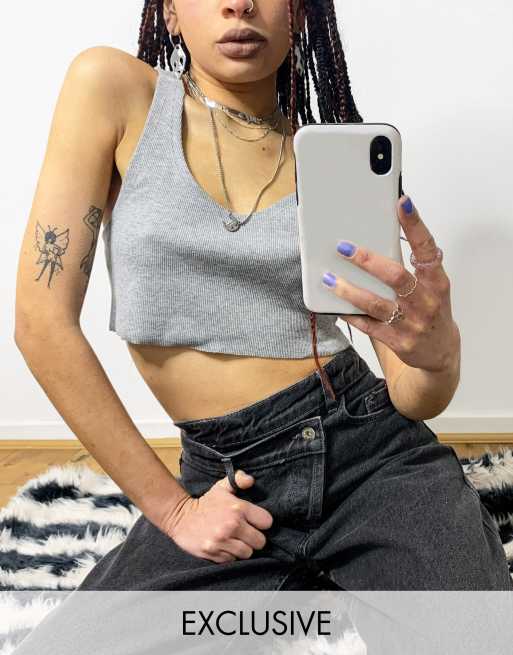 COLLUSION – Geripptes, kurzes Trägertop mit offenem Saum in Grau meliert