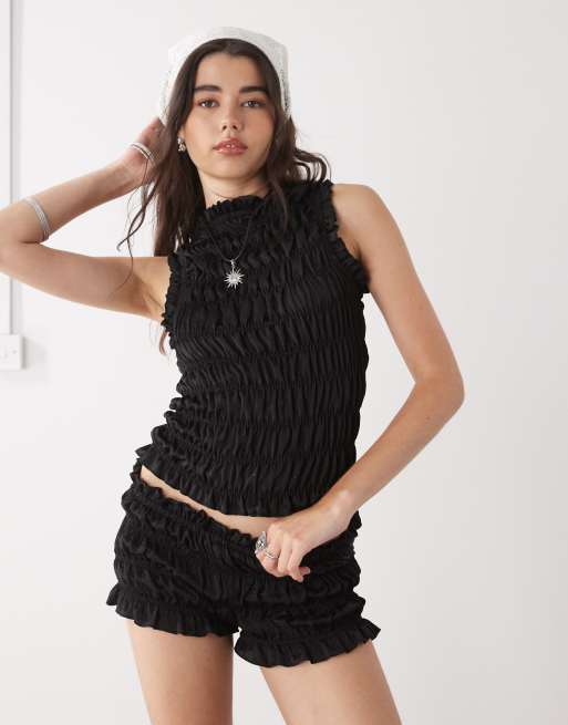 COLLUSION – Gesmokte Micro-Shorts in schwarzer Satinoptik, Kombiteil